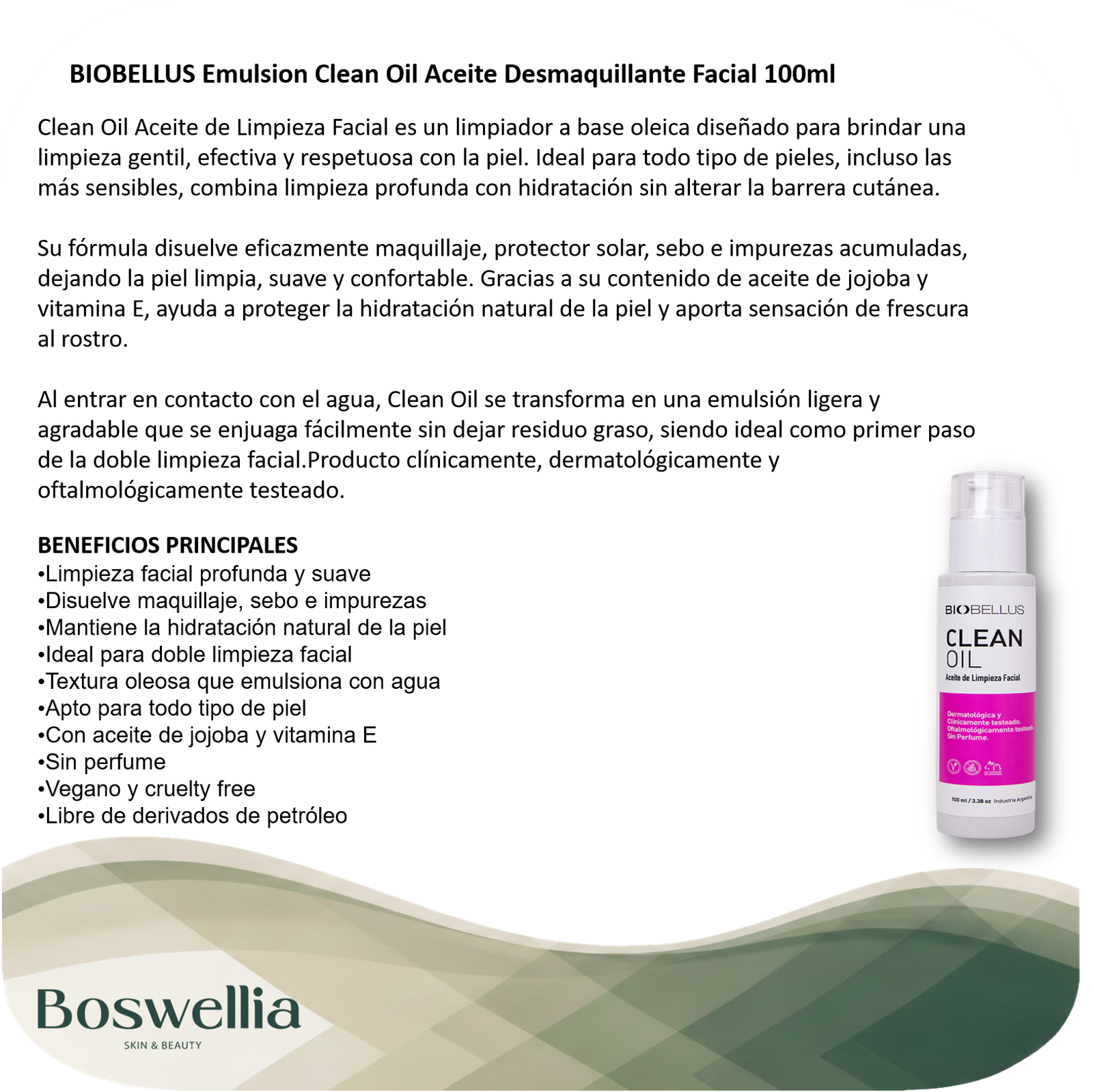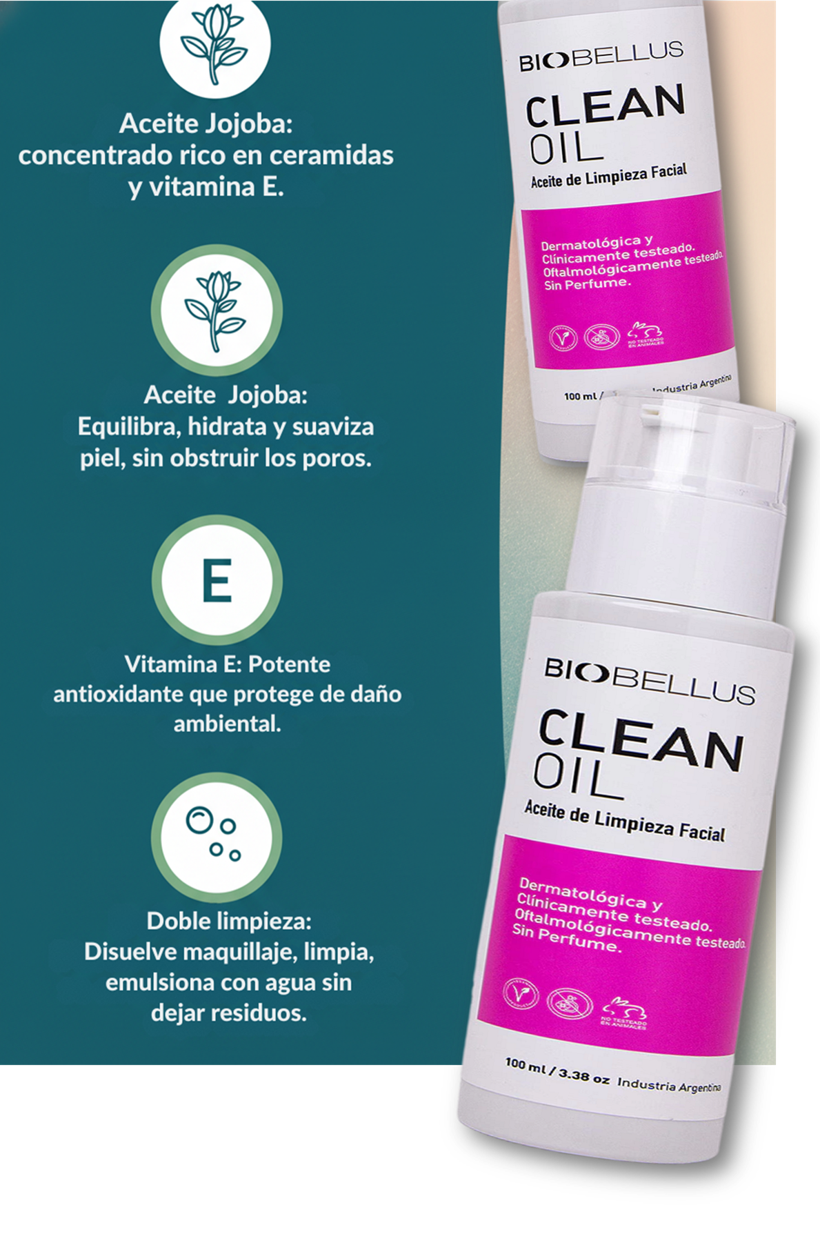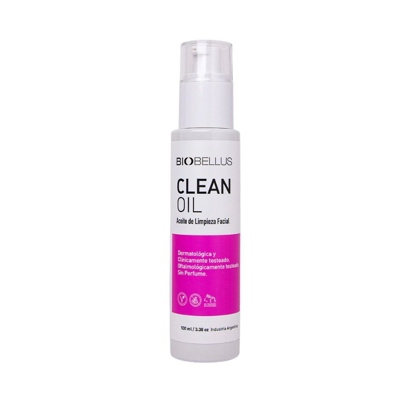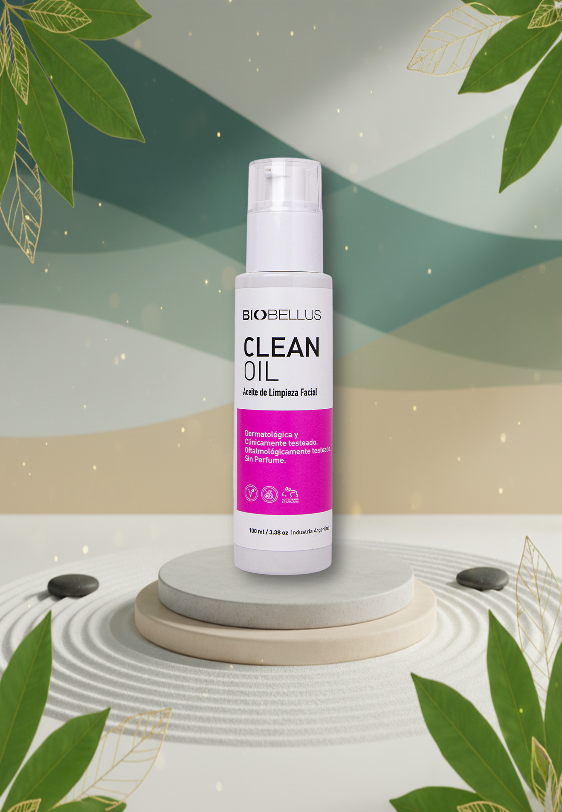El aceite de limpieza facial Clean Oil limpia profundamente y elimina maquillaje e impurezas sin resecar. Con jojoba y vitamina E, hidrata, calma y protege la barrera cutánea. Libre de sulfatos y perfumes, es ideal para doble limpieza.