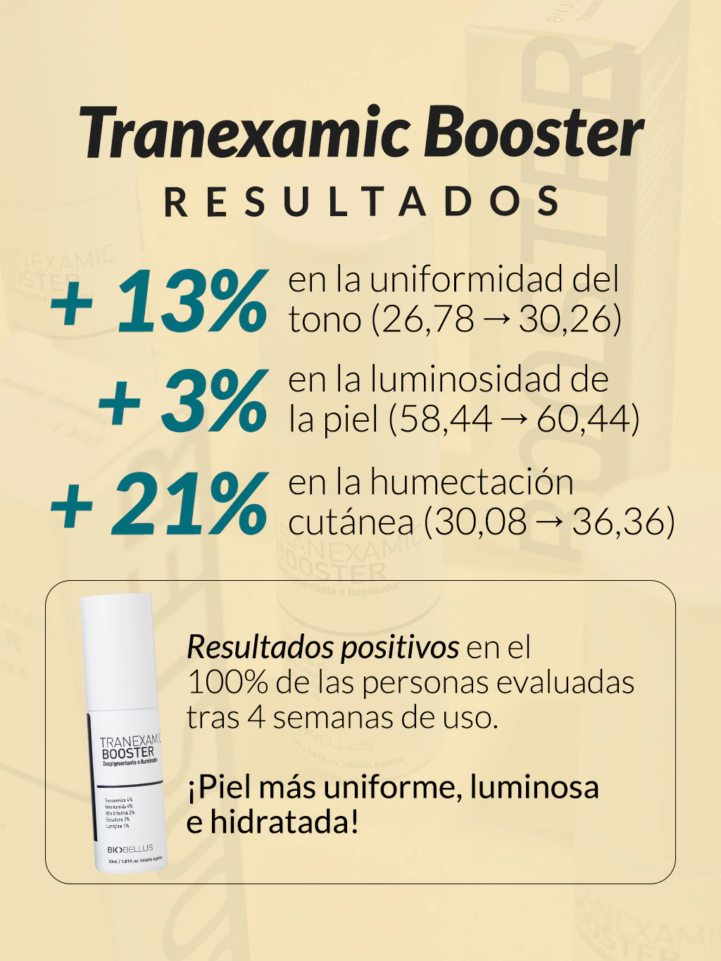 Tratamiento: Aplicá unas gotas de Tranexamic Booster tanto por la mañana como por la noche.